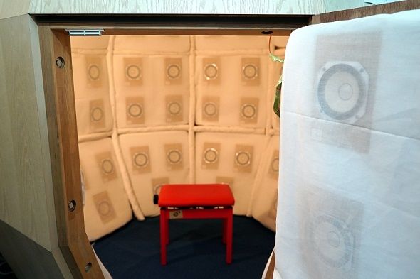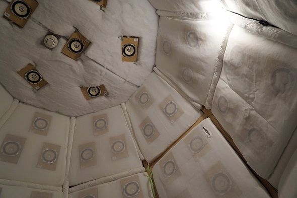 実際に音響樽の中に入って試聴してみた。ドアを開けて中に入り、中央に置かれた椅子に腰掛ける。96個のスピーカーに